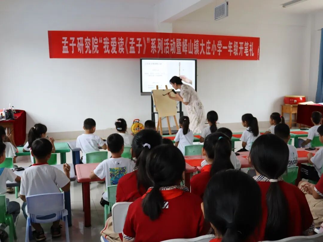 9月3日,孟子研究院“我愛讀《孟子》”系列活動暨鄒城市大莊小學開筆禮在嶧山鎮大莊小學舉行。嶧山鎮政府、嶧山鎮中心學校、孟子研究院傳承普及部工作人員及大莊小學全體師生二百余人齊聚一堂,以千年古禮為一年級新生開啟人生第一課,讓“啟智立德、尊師重道”的儒家文脈,在莊重儀式中沁潤童心。