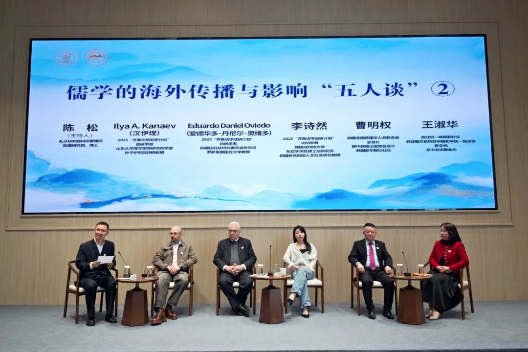 儒學的海外傳播與影響“五人談”第二組由孔子研究院科研管理部助理研究員陳松博士主持, 2025“齊魯訪學駐研計劃”駐研學者、山東大學儒學高等研究院學者、孫子研究院特聘教授Ilya A. Kanaev(漢伊理),2025“齊魯訪學駐研計劃”訪問學者、阿根廷科技研究委員會研究員、阿根廷羅薩里奧國立大學教授Eduardo Daniel Oviedo(愛德華多·丹尼爾·奧維多),2025“齊魯訪學駐研計劃”訪問學者、韓國成均館大學東亞學術院博士后研究員、韓國研究財團人文社會研究教授李詩然,韓國全國韓籍華人總聯合會總會長、韓中新聞記者協會會長、韓國新華報社社長曹明權,西非統一商報副社長、西非暨尼日利亞中國和平統一促進會副會長、尼中友協副會長王淑華擔任訪談嘉賓。